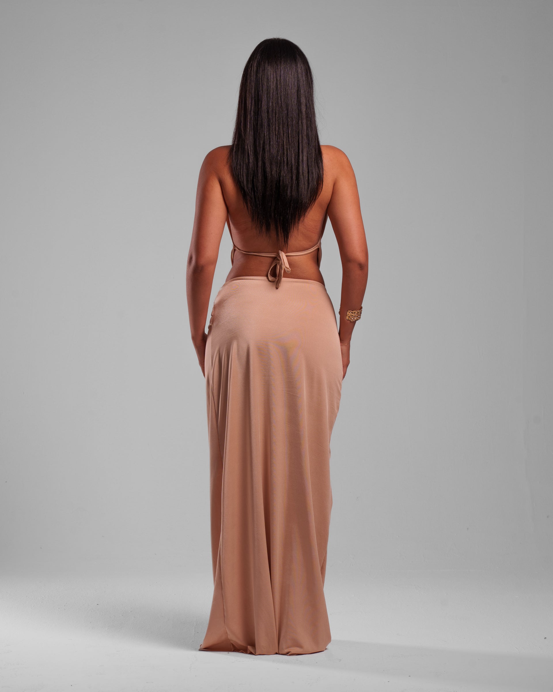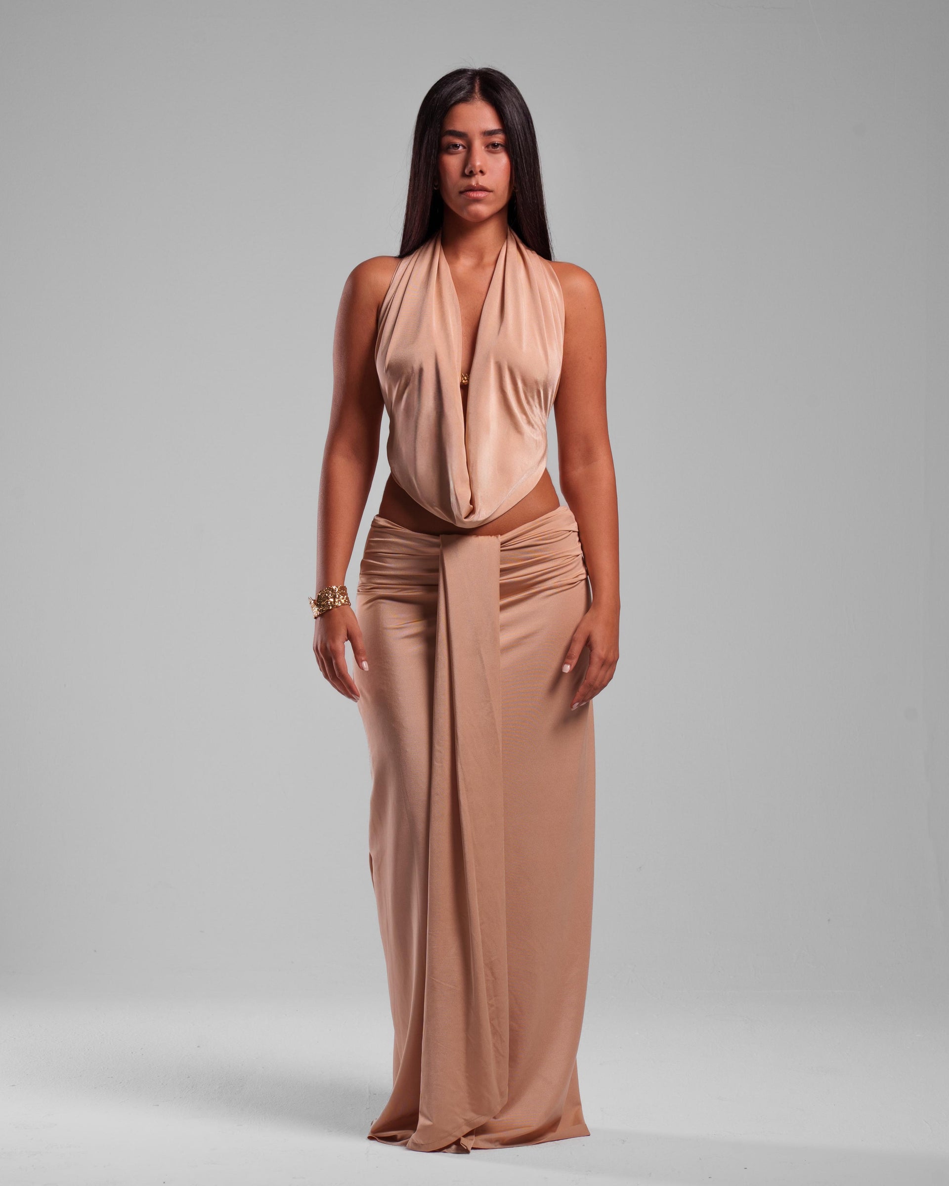 Make a bold statement with the Zia Set, a radiant blend of elegance and sensual design. This set features a nude-toned maxi skirt with a flowing front drape, perfectly matched with a deep-plunge halter top that drapes effortlessly. Designed in a soft, stretchy fabric that contours your body for a flattering silhouette and all-day ease.