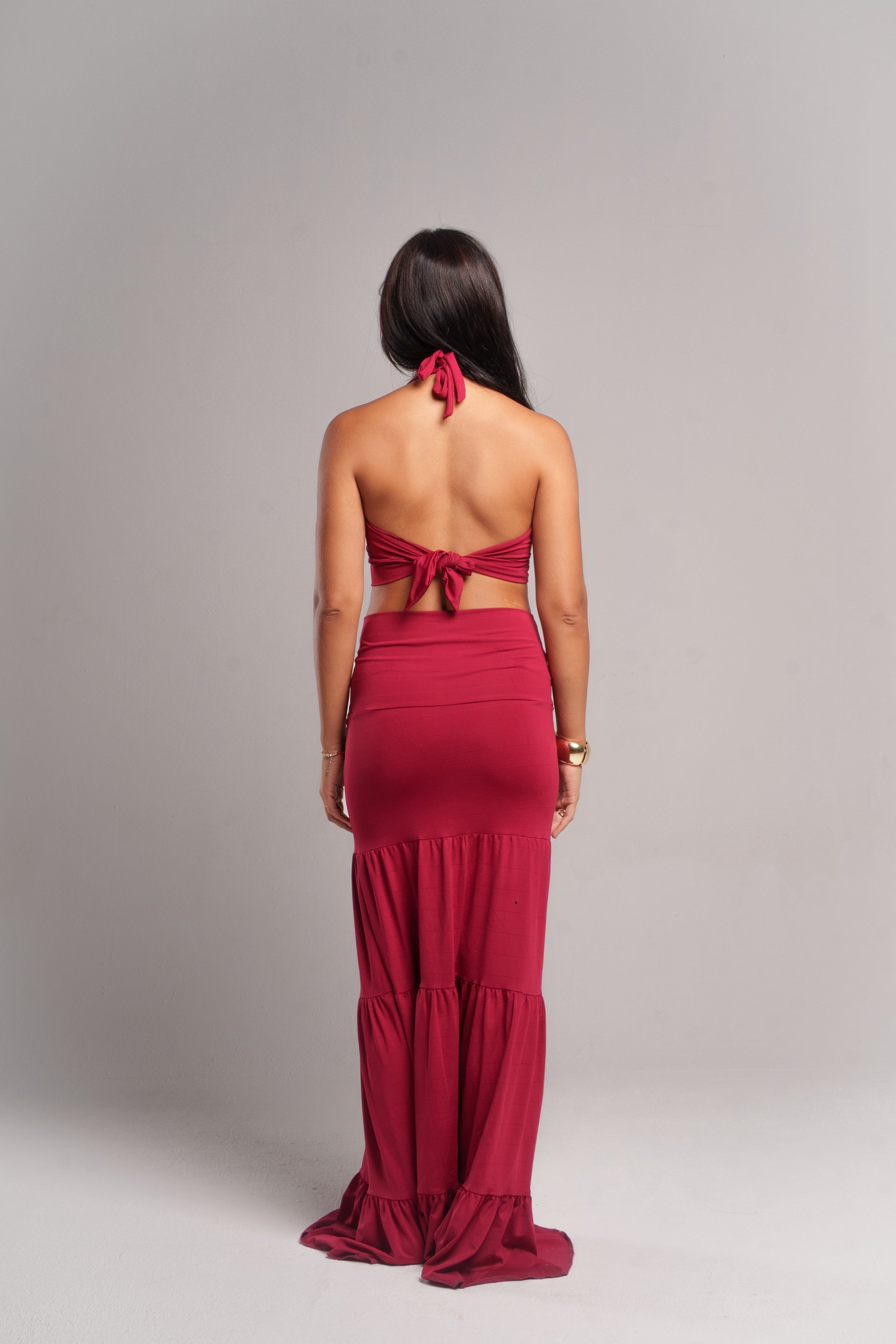 Bold, confident, and effortlessly chic—the Wild Cherry Set is your statement look for day-to-night elegance.This two-piece set features a halter crop top with gold-tone ring accents and a flattering twist-front detail, paired with a matching high-waisted maxi skirt. The skirt mirrors the twist-front design at the waist for a seamless, coordinated look and cascades into tiered layers for added volume and movement. Crafted from a soft, stretchy fabric, it hugs your figure in all the right places while keeping you comfortable.