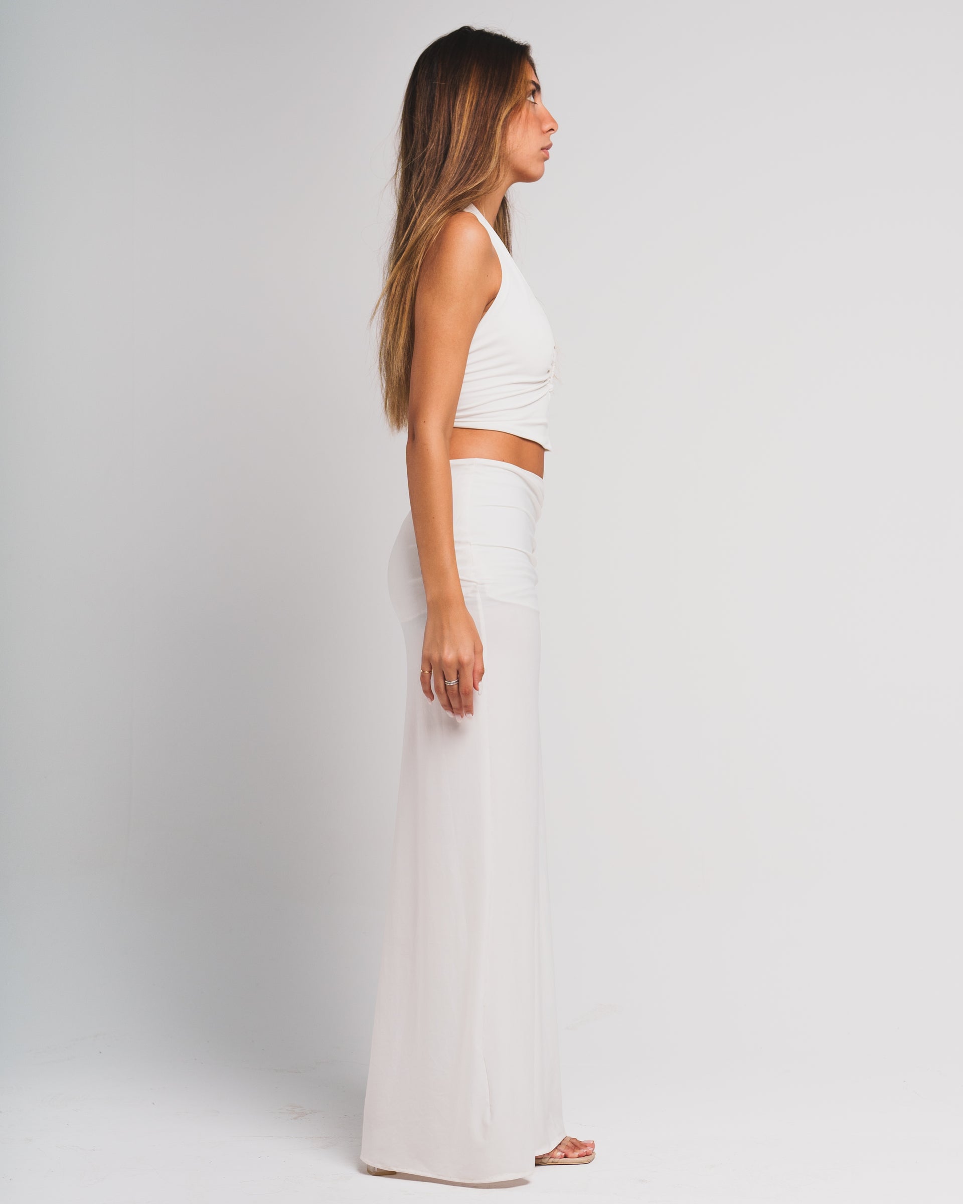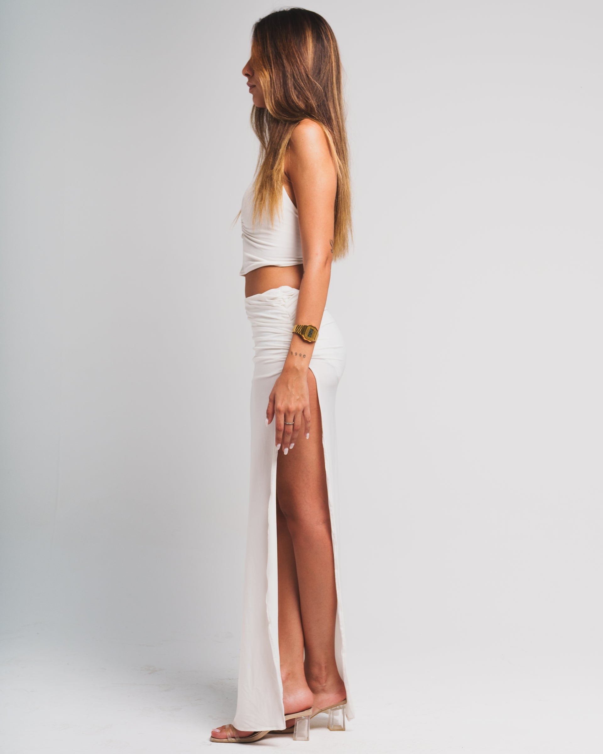 Elevate your style with the White Gold Set, a stunning combination of elegance and modern design. This set includes a white maxi skirt with a chic side slit, paired with a white halter backless crop top featuring a striking gold accessory. The stretchy, figure-hugging fabric ensures a perfect fit that flatters your silhouette while offering all-day comfort.